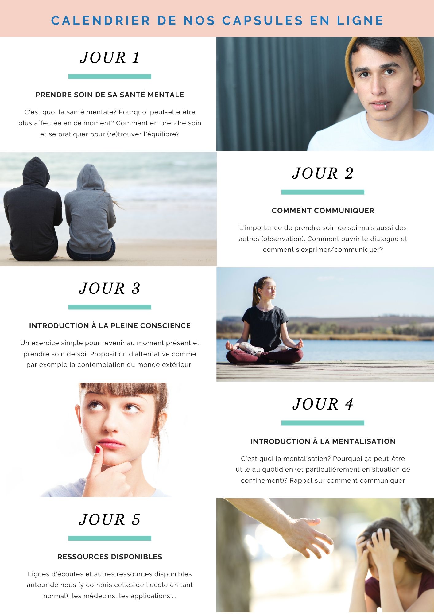 Parce qu’en ces temps où l’équilibre de tous se trouve ébranlé, il est d’autant plus nécessaire de prendre soin de sa santé mentale! Nous avons donc adapté le contenu de nos animations en classe de manière à le rendre accessible aux jeunes, en tout temps, et pour les aider à mieux vivre cette période de confinement.